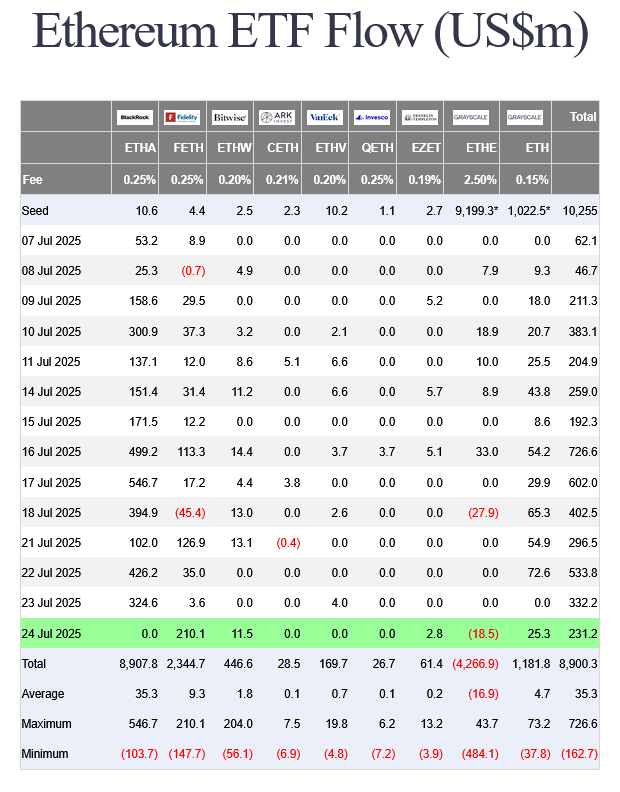 Spot Ether ETFs recorded a net inflow of nearly $2.4 billion in the past six trading days, far above spot Bitcoin ETFs, which recorded only $827 million during the same period, according to Farside Investors.