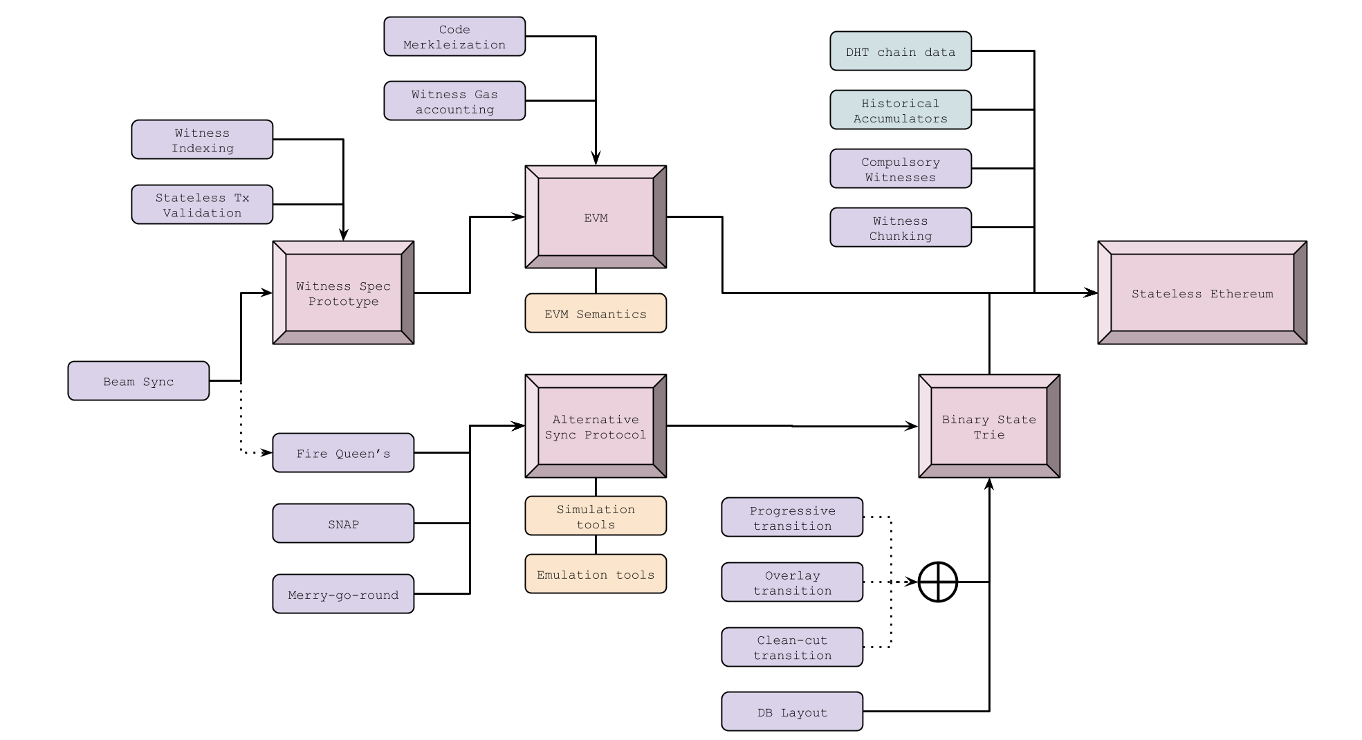 Smaller elements of the tree in purple are more specific dependencies that will lead to the major milestones being « unlocked ». The purple ones are required in the sense that they need to be fully understood before the milestone can be considered finished, but they don’t necessarily need to be implemented or accepted. For example, it is possible that after more research, we find that code merkleization doesn’t reduce witness sizes sufficiently to justify the time and effort it would take to implement it; we would then consider it ‘finished’, because it no longer needs to be investigated.