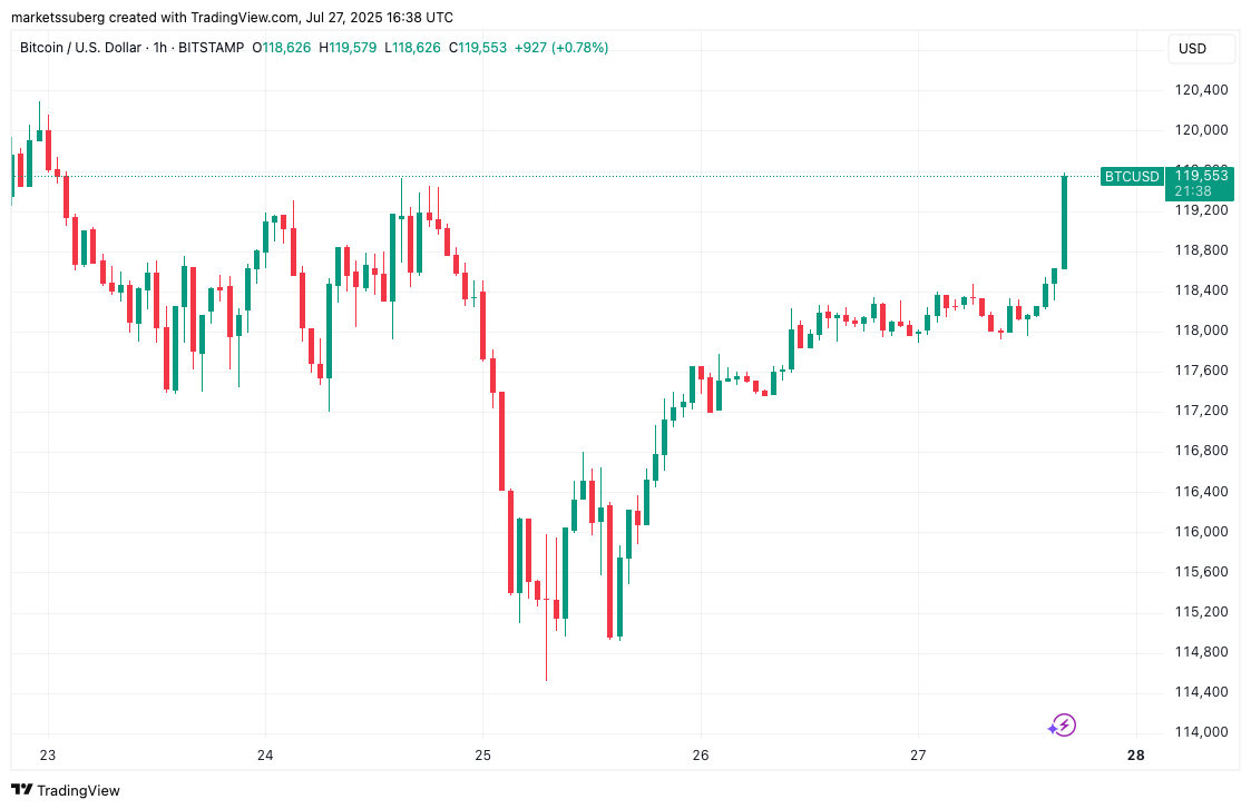 Bitcoin (BTC) surged above $119,000 Sunday as bulls extended a rebound from two-week lows.