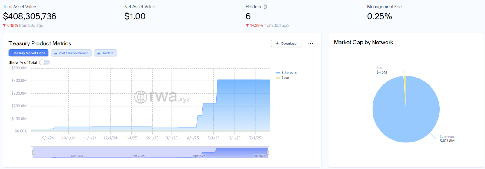 JTRSY is an actively managed onchain fund providing access to short-term US Treasury bills, also issued through Centrifuge. It holds over $408 million in assets, largely on Ethereum.