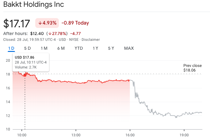 Shares in Bakkt Holdings (BKKT) closed trading on Monday down nearly 5% and continued to fall around 27.8% after-hours to $12.40, adding to a nearly 31% slump its seen so far this year.