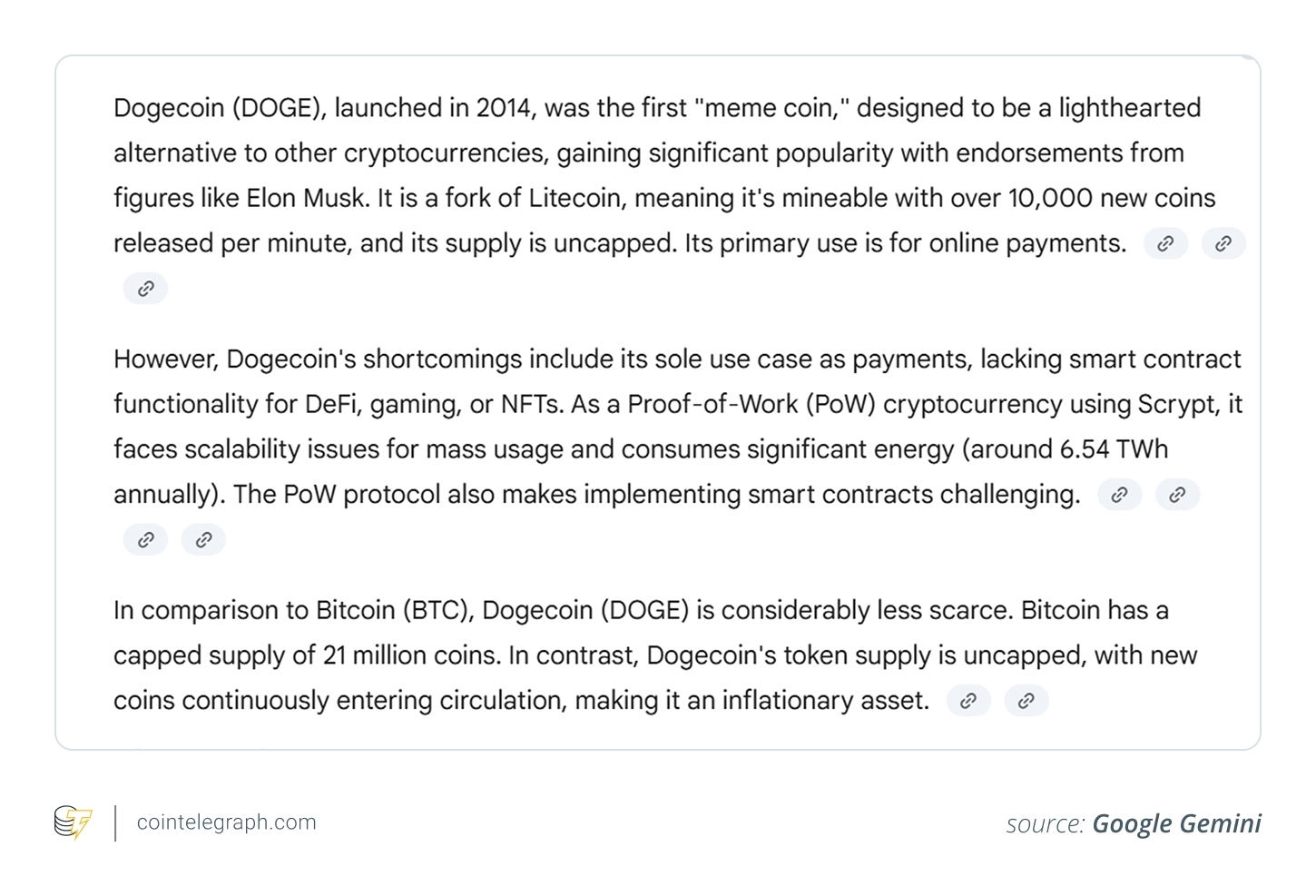 In response, Gemini describes Dogecoin as a memecoin used mainly for payments, with an uncapped supply and over 10,000 coins minted per minute. It lacks smart contract features, faces energy and scalability issues due to PoW and is inflationary compared to Bitcoin (BTC), which has a fixed supply of 21 million coins.