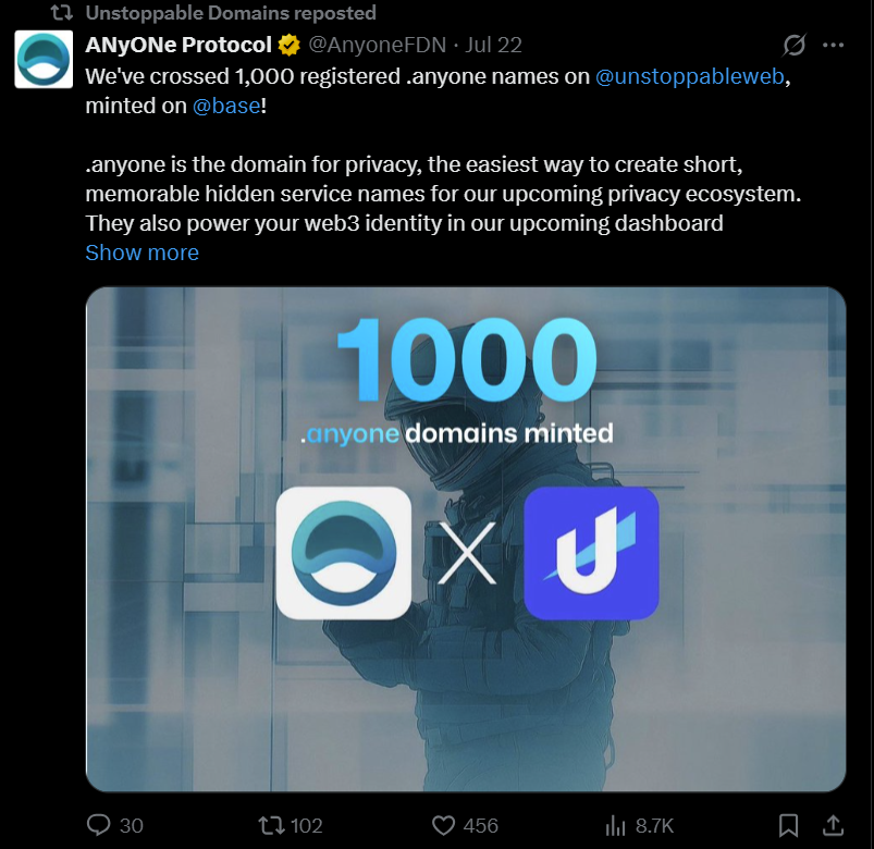 An example of privacy-focused decentralized domain offerings through Unstoppable Domains. Source: AnyoneFDN