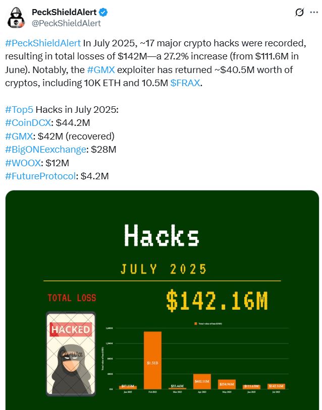The total monthly losses represented a 27% increase from the $111 million in June, blockchain security firm PeckShield said in an X post on Friday.