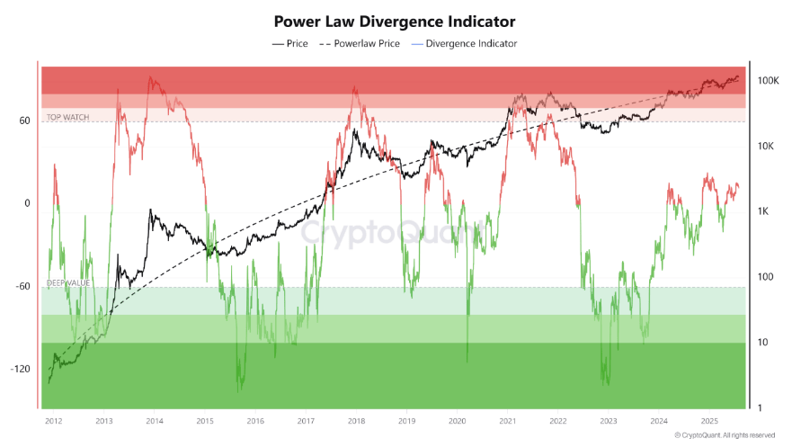 Based on reports by Arab Chain using CryptoQuant data, Bitcoin’s price is tracking a Power Law trend that suggests a smooth, logarithmic rise over time.
