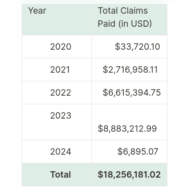 Nexus Mutual maintains a transparent claims history and enables its verification onchain. Since its inception in 2020, the service has reportedly paid $18,256,181 worth of claims to its users.