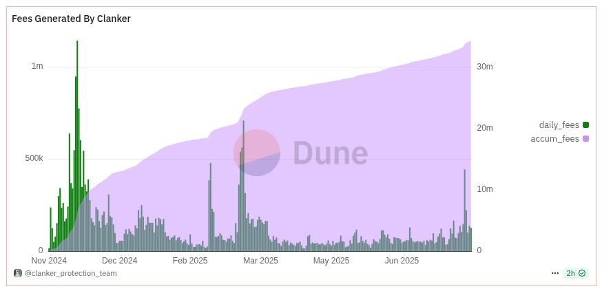 Clanker, a decentralized application (DApp) built around an artificial intelligence agent that creates memecoins based on prompts, has generated over $34.4 million in fees, according to blockchain data.