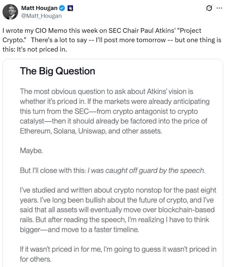 Bitwise’s Matt Hougan on Tuesday said the speech caught him “off guard” and left him wondering whether Atkins’ vision has been priced into the market.