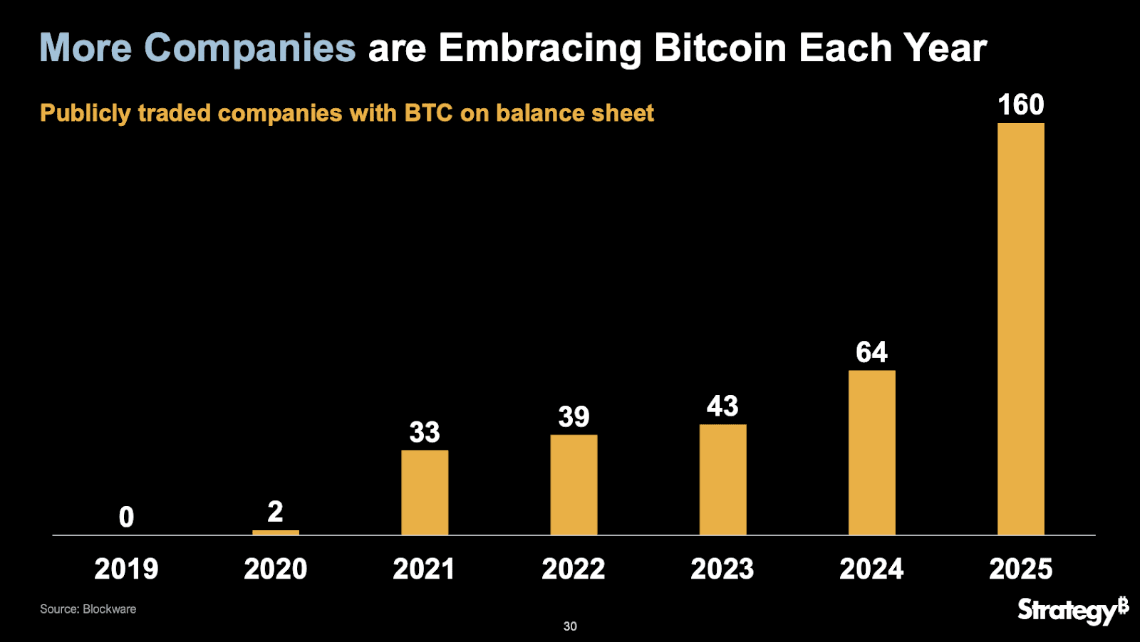 Institutional adoption continues to break records. In 2023, just 43 publicly traded companies held Bitcoin on their balance sheets. That number rose to 64 in 2024 and has now surpassed 160 in 2025, according to Blockware.
