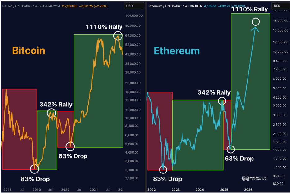 Ethereum’s weekly chart has been following the same sequence almost step-for-step in the past few years. After a steep 83% decline from its 2021 peak, Ethereum mounted a 342% rebound, only to experience a deep retracement of roughly 63% to $1,500 in April 2025. Since then, however, Ethereum has mounted another rebound, with the latest move being the most recent rally back above $4,200.