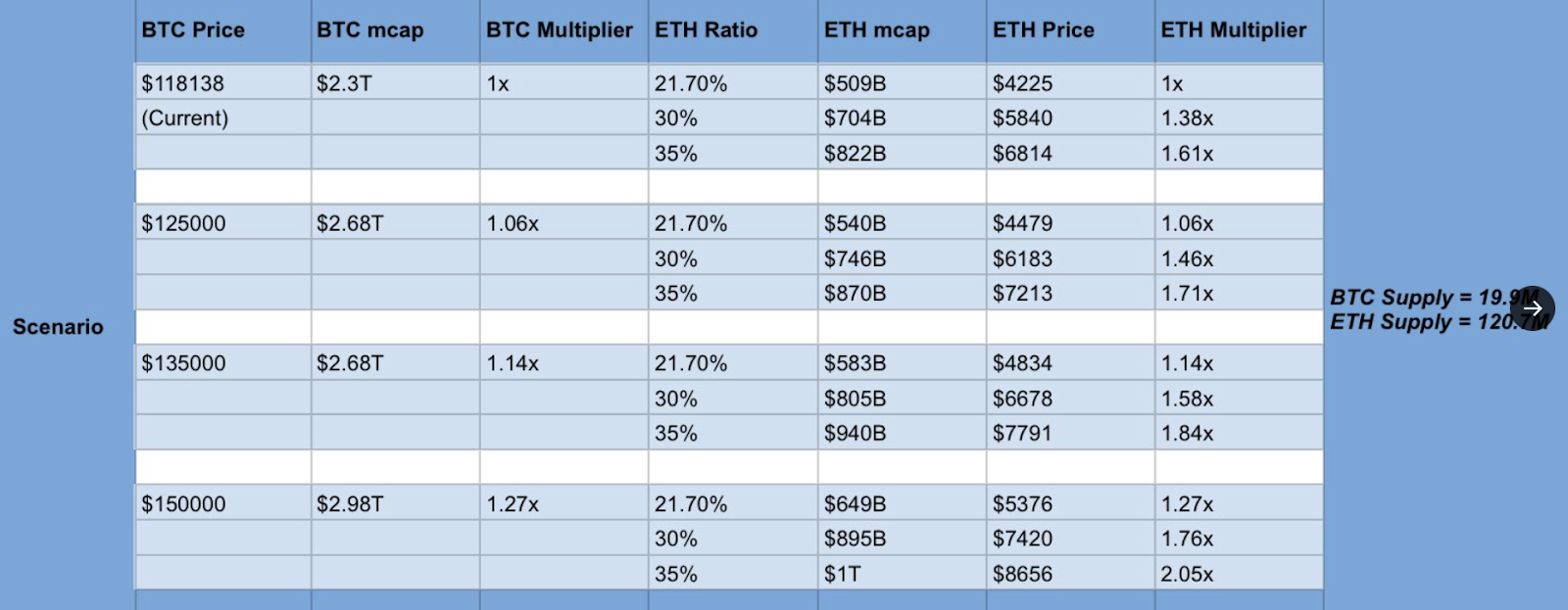 Yashasedu said that if Bitcoin (BTC) reaches $150,000 — a 25% increase from its current price of $119,335 — then ETH may soar to $8,656, assuming Ether reaches 35% of Bitcoin’s market cap as in previous cycles.