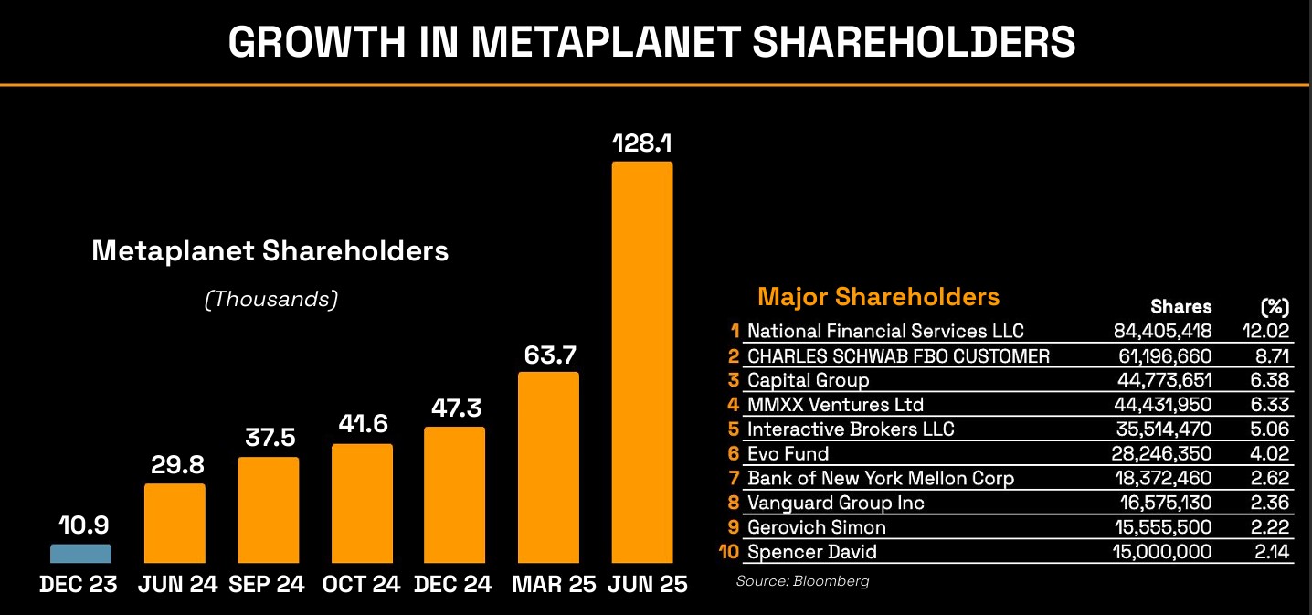 Investors are placing bets on Metaplanet’s Bitcoin strategy paying off. According to the report, the number of Metaplanet shareholders climbed to over 180,000 as of June 2025, up 350% since it started its Bitcoin accumulation strategy in the fourth quarter of 2024.