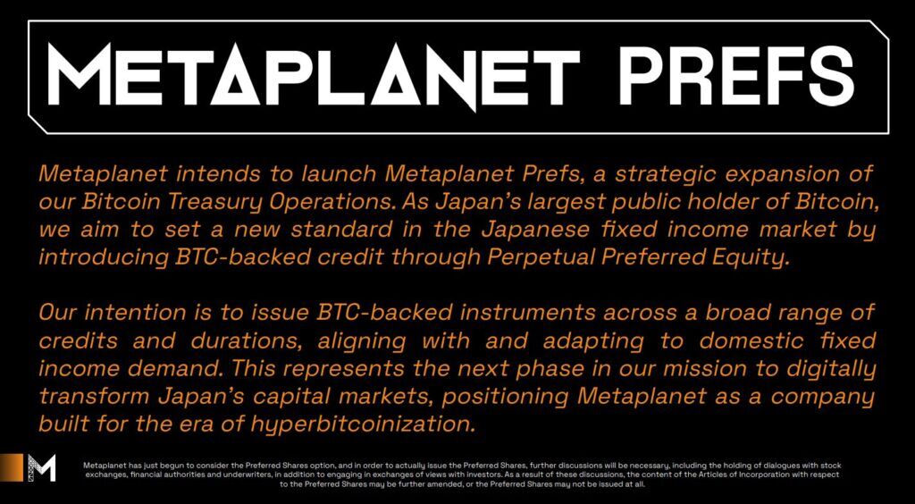 - “Metaplanet Prefs” — a program of Bitcoin-Backed Preferred Shares designed to scale its Bitcoin treasury operations.