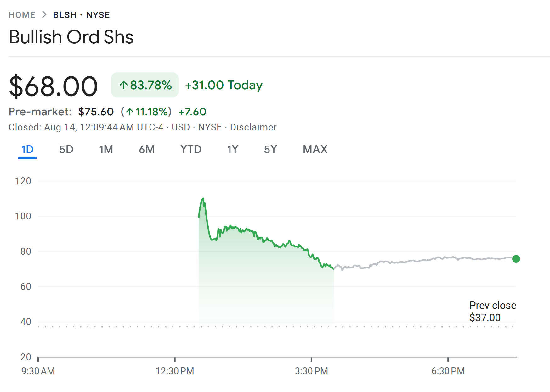 Bullish’s stock ended its first trading session up 83.8% from its IPO price of $37, closing with a market capitalization above $10 billion. Shares jumped another 11.2% in after-hours trading.