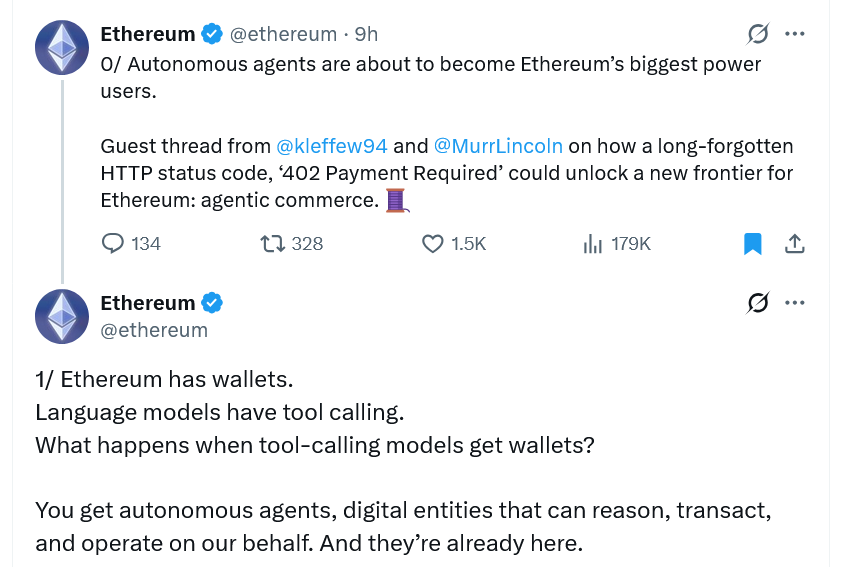 The pair said autonomous agents could become Ethereum’s “biggest power user” in the X post. Coinbase has already implemented HTTP 402 via the “x402 payments protocol,” according to its GitHub account.