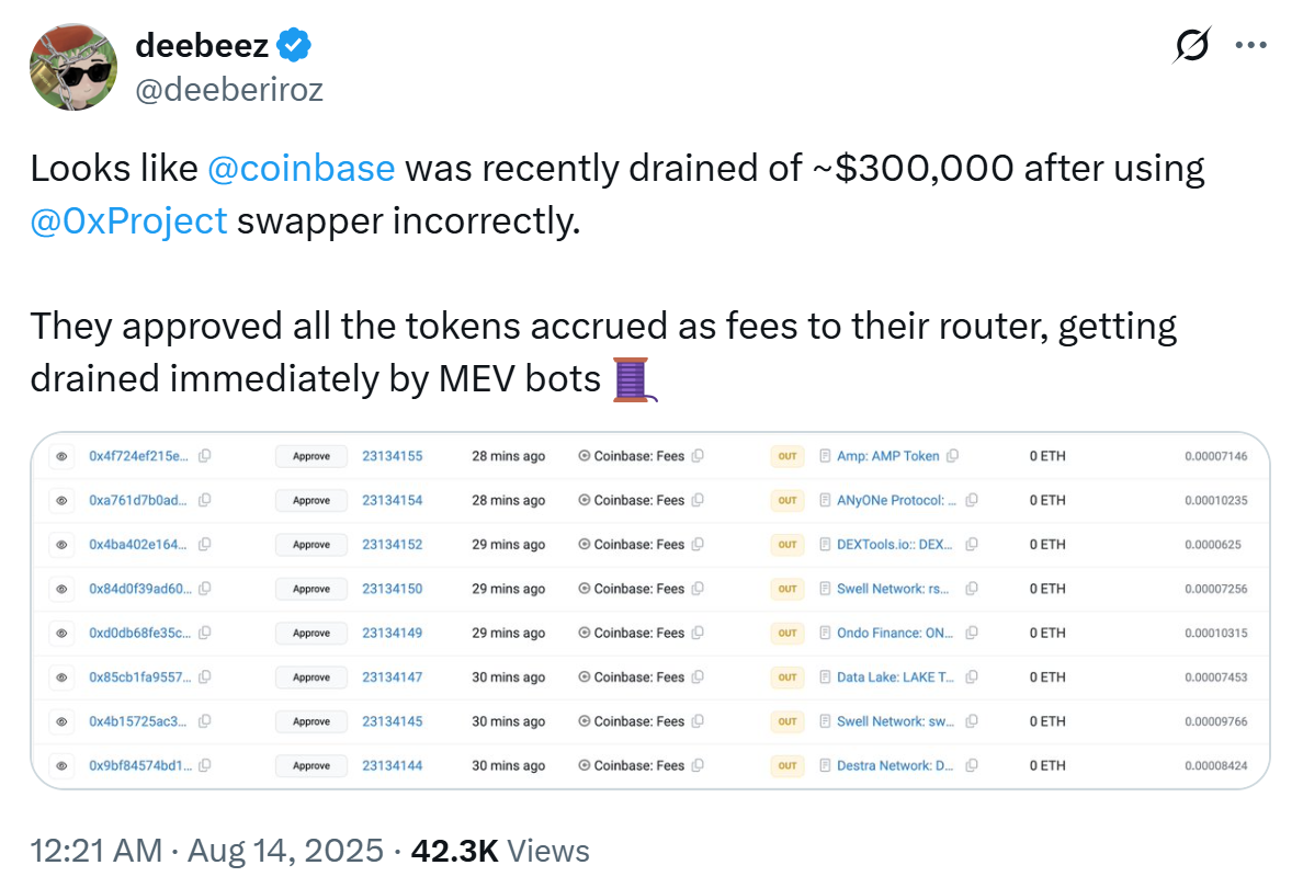 Coinbase lost about $300,000 in token fees after mistakenly approving assets to a 0x Project smart contract, allowing a maximal extractable value (MEV) bot to drain the funds.