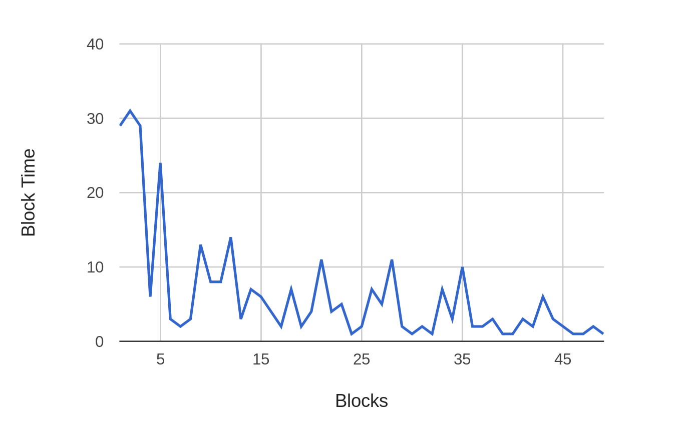 After a few thousand blocks, we see the difficulty going up enough for block times to get into the 4-5 second range. After 9k blocks, we’re starting to approach the target time of 15 seconds.
