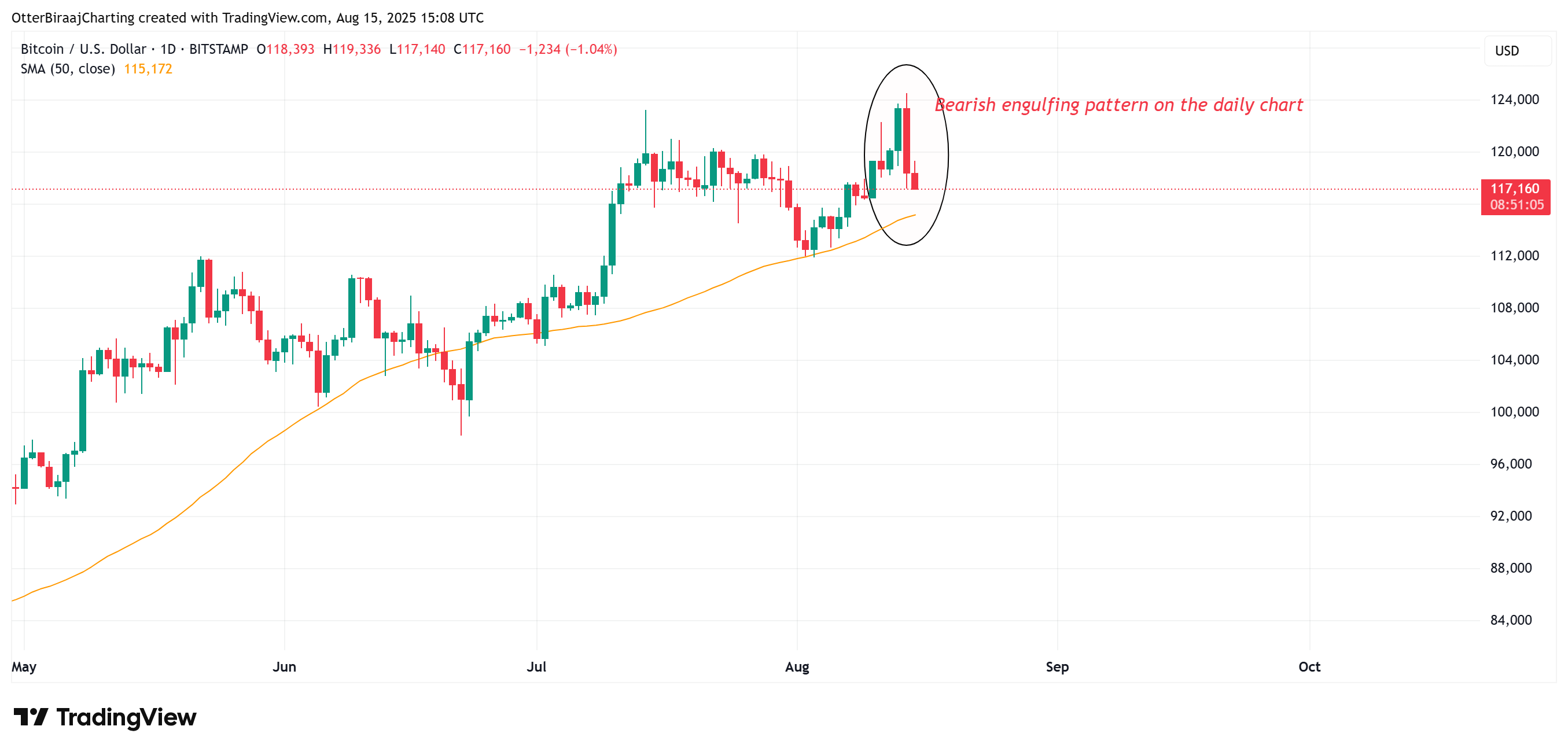 Bitcoin (BTC) saw a sharp correction on Thursday, slipping below $117,000 on Aug. 14, marking its steepest pullback in a month. The daily chart flashed a bearish engulfing pattern for the first time since July 15, raising concerns that seasonal weakness during Asia’s “ghost month” could extend the downturn.