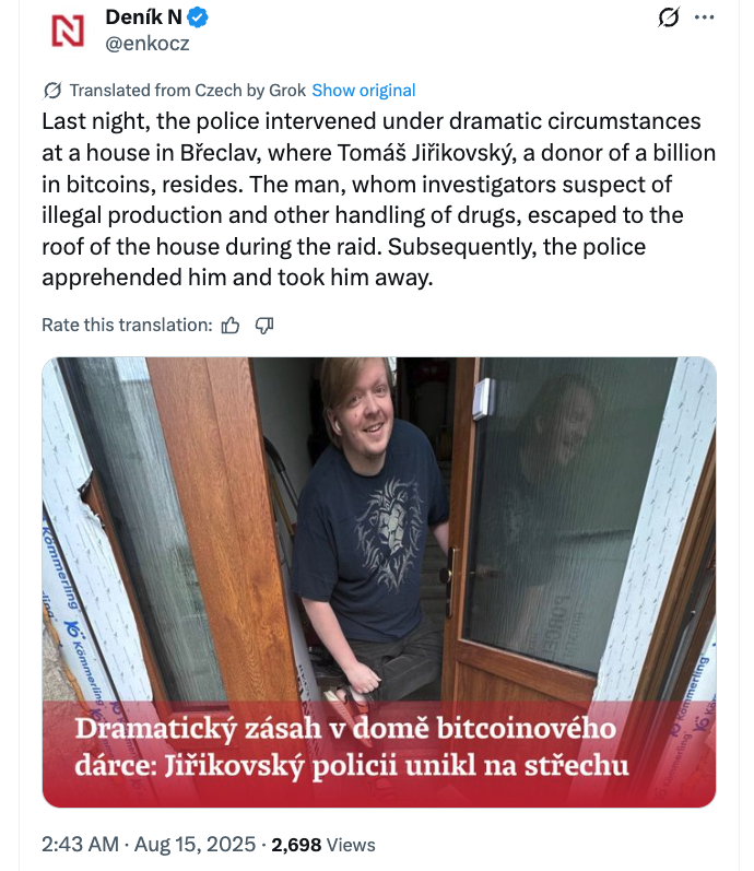 Although the statement did not mention any arrests, local reports suggested that police detained Tomas Jirikovsky, a convicted criminal who allegedly paid 468 BTC (worth around $45 million at the time) to the minister to avoid a new prison sentence.