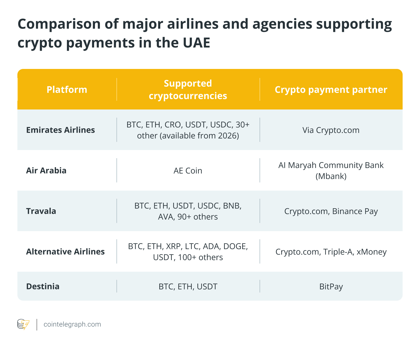 • Airlines and travel agencies, including Emirates, Air Arabia, Travala and Alternative Airlines, now support cryptocurrency payments for bookings, targeting tech-savvy travelers and digital nomads.