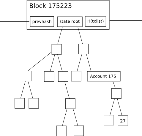 First of all, let us begin by exploring why the current Ethereum client database is so large. Ethereum, unlike Bitcoin, has the property that every block contains something called the « state root »: the root hash of a specialized kind of Merkle tree which stores the entire state of the system: all account balances, contract storage, contract code and account nonces are inside.
