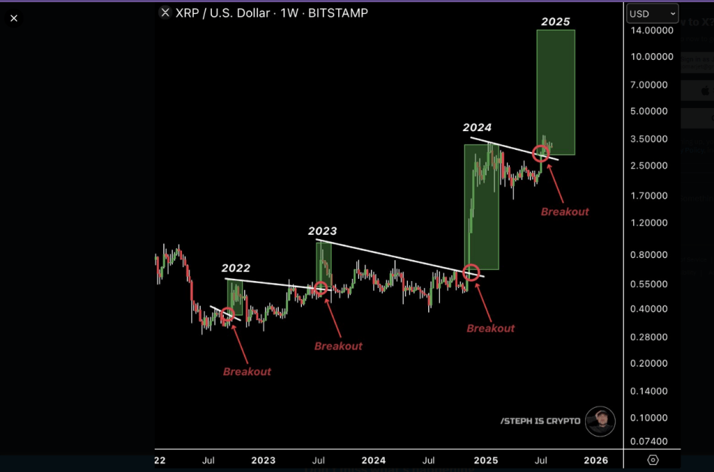 According to analyst Steph, a breakout above a long-running descending trendline on the weekly XRP chart is what matters now.