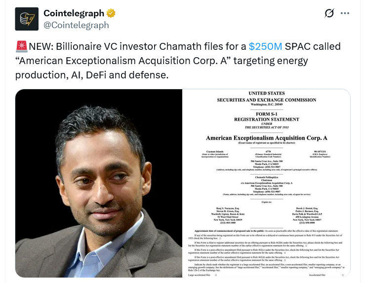Early Bitcoin investor and billionaire Chamath Palihapitiya filed to raise $250 million in blank-check company “American Exceptionalism Acquisition Corp A,” targeting the decentralized finance, AI, energy and defense sectors.