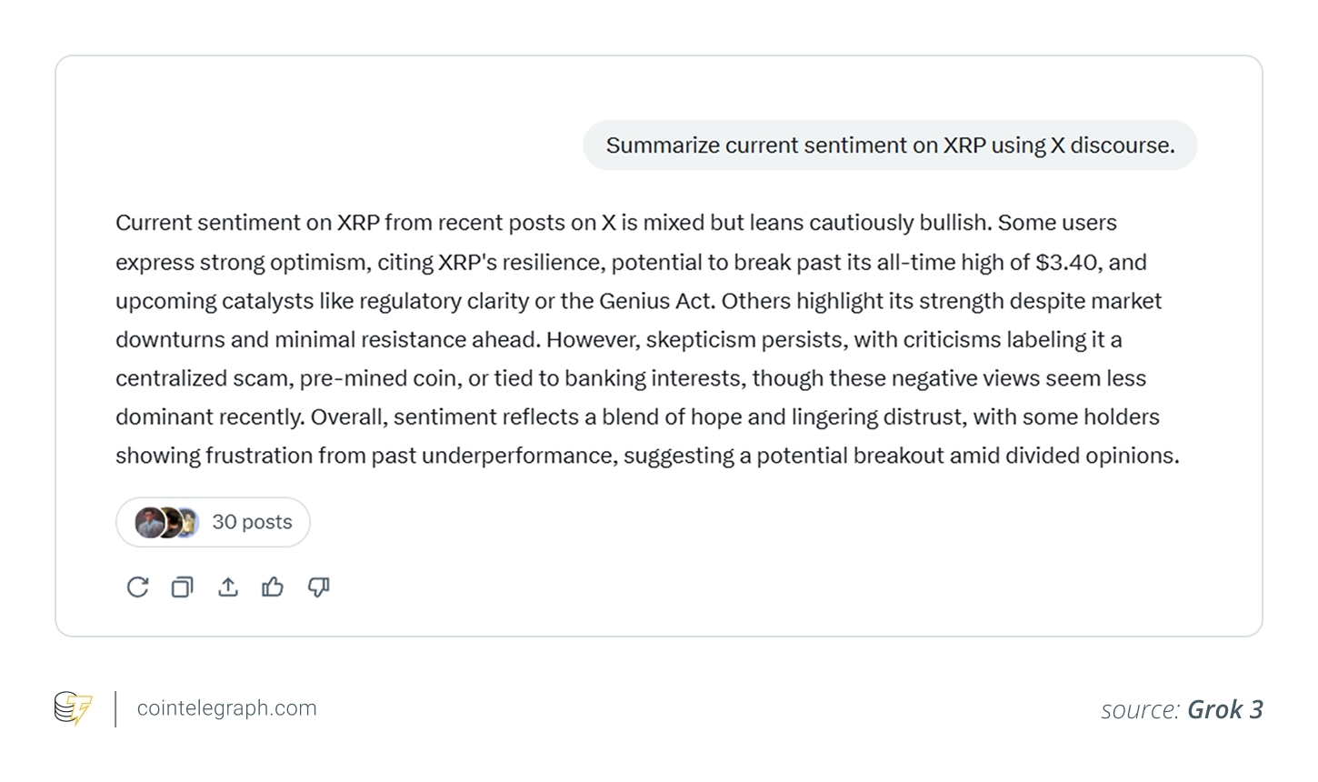According to Grok, XRP (XRP) sentiment on X is mixed but cautiously bullish. It highlights optimism around regulatory catalysts and resilience while acknowledging lingering skepticism over centralization and past underperformance. The summary is well-balanced, context-rich and captures the emotional and narrative divide within the XRP community.