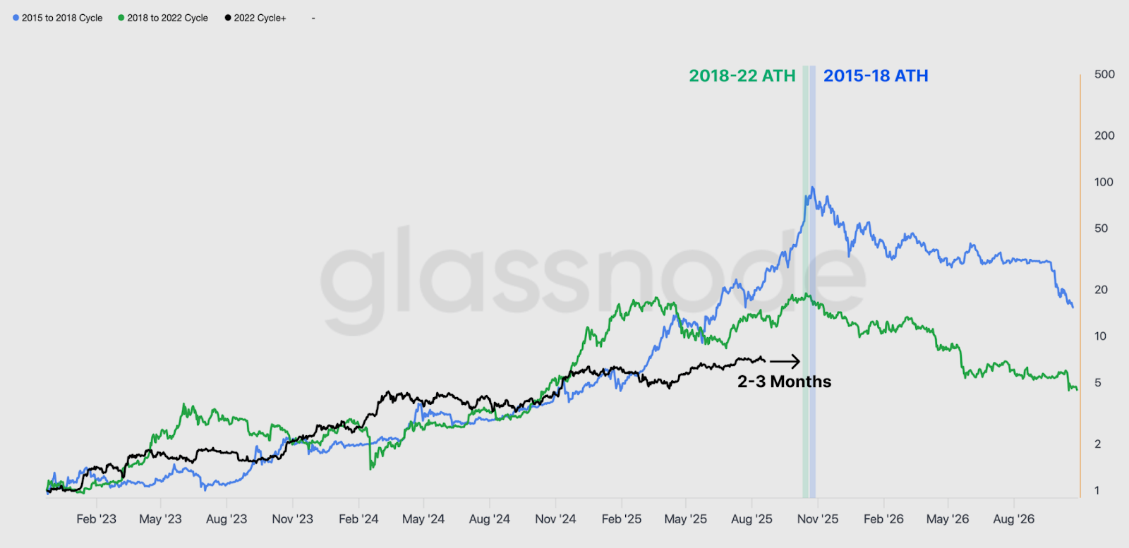 When compared with past cycles, this performance suggests that BTC price is roughly two to three months away from the cycle top, according to market intelligence firm Glassnode.