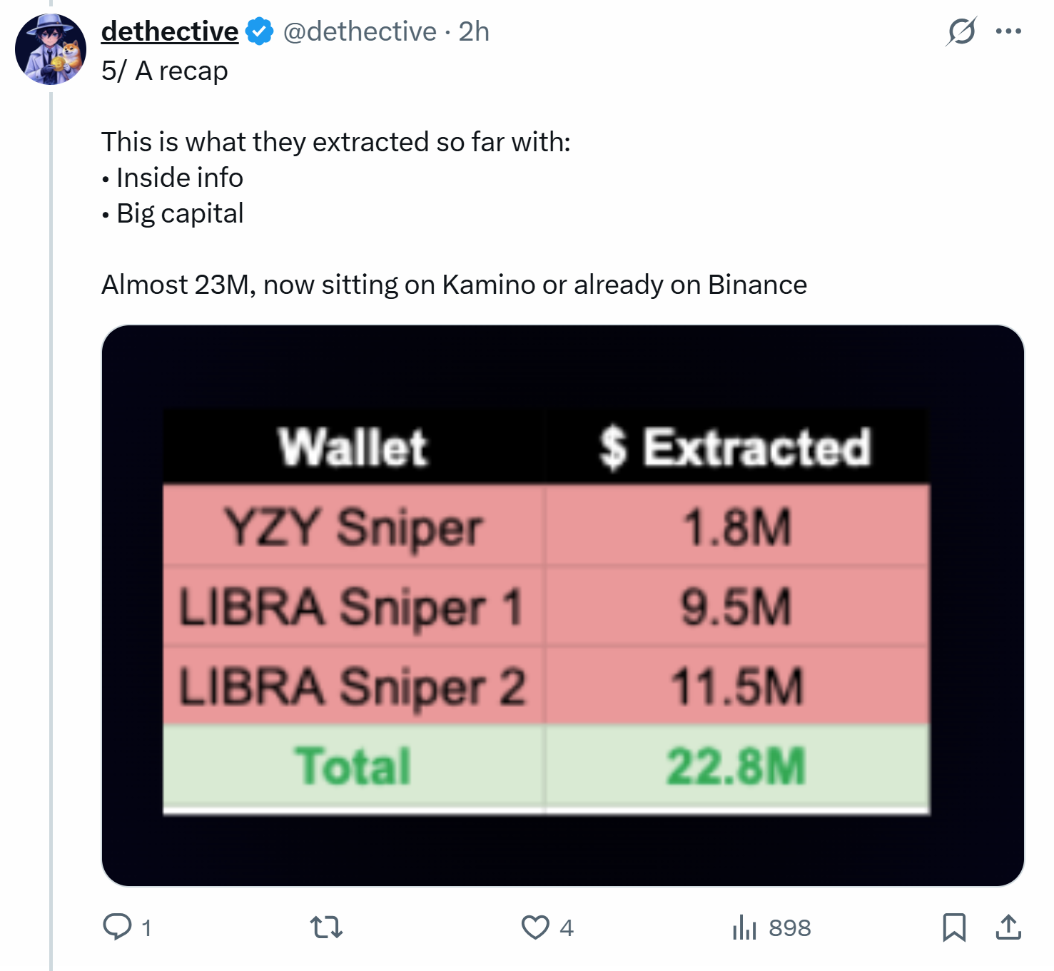 “We can be sure this is someone with clear inside info,” Dethective wrote. “The proof is that he did not snipe any coin besides $YZY and $LIBRA and he was prepared with huge size,” they added.