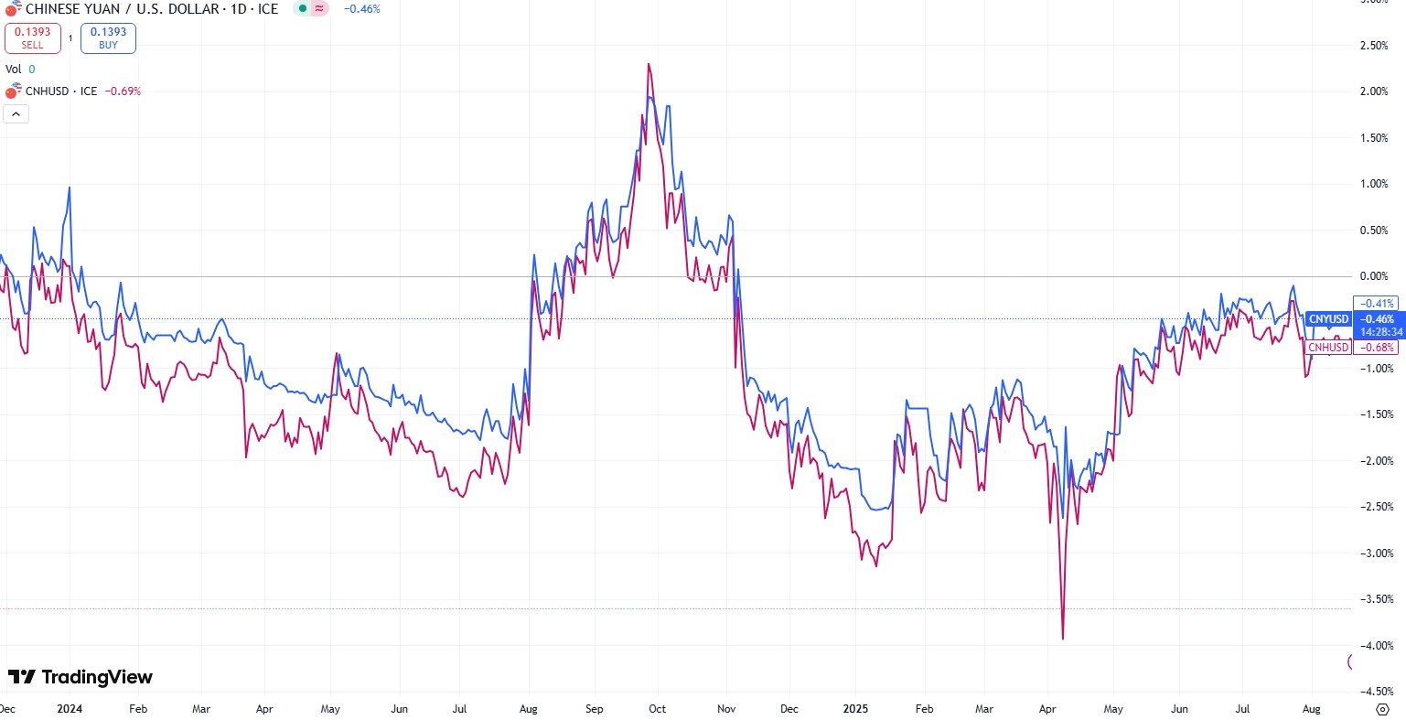 The CNY and CNH are one currency but can trade at different prices. Source: TradingView