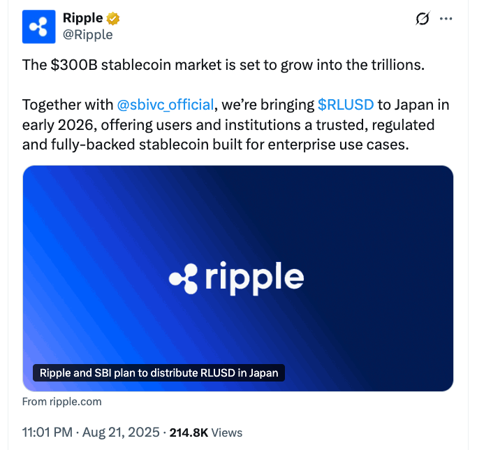 While the Circle announcement mentions the establishment of a joint venture with SBI, the partnership with Ripple aims to establish RLUSD distribution in Japan through SBI’s crypto subsidiary SBI VC Trade.