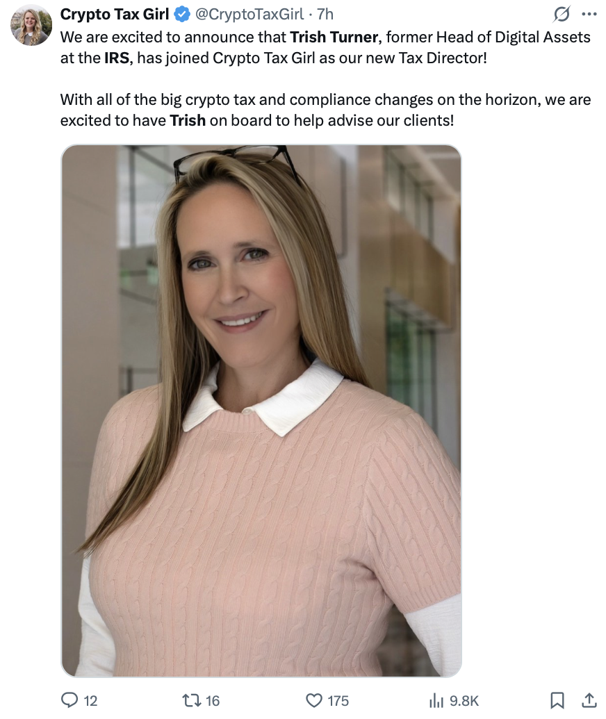 Bloomberg Tax reported on Friday that Turner told the publication during an interview that she will become the tax director at the crypto tax firm Crypto Tax Girl. On the same day, Crypto Tax Girl founder Laura Walter said in a LinkedIn post that Turner will join the firm.