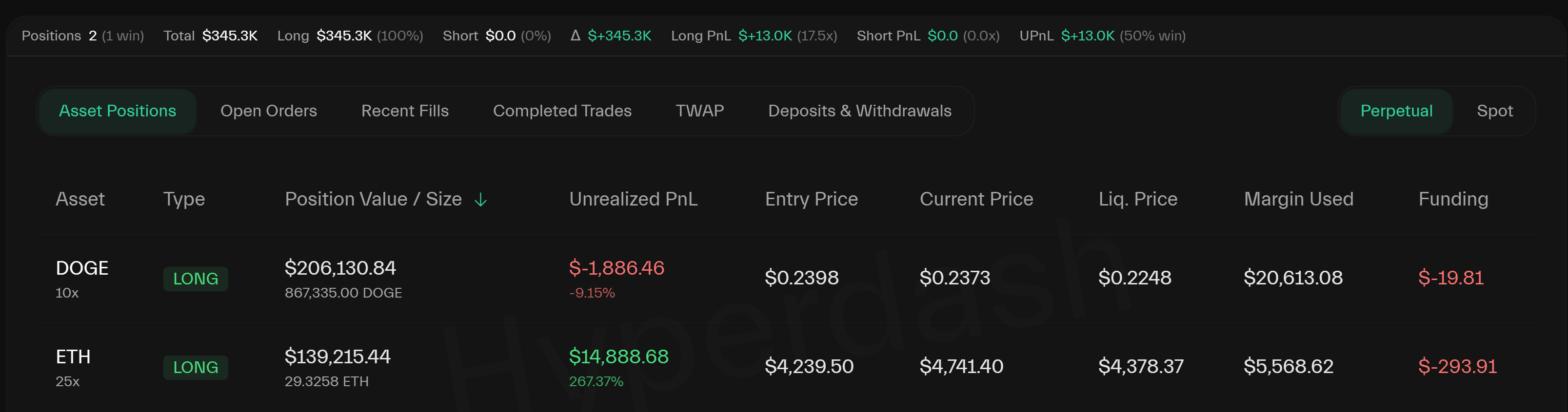Wynn is also running a 10x Dogecoin (DOGE) long, valued at $206,130 for 867,335 DOGE. Entered at an average price of $0.2398, the trade is slightly underwater, showing an unrealized loss of $1,886 with DOGE currently near $0.237.
