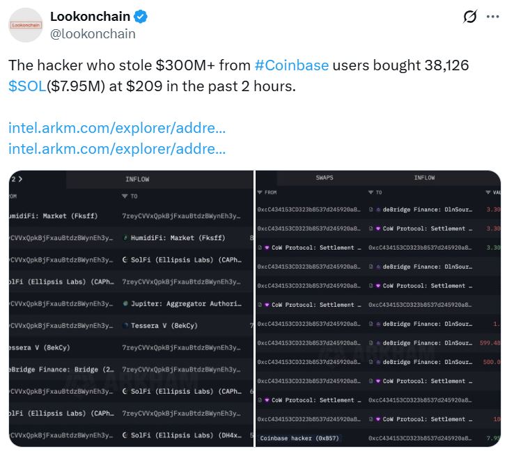 A wallet address labeled by blockchain security analysts as the “Coinbase hacker” bought $8 million in Solana on Sunday using reportedly ill-gotten gains.