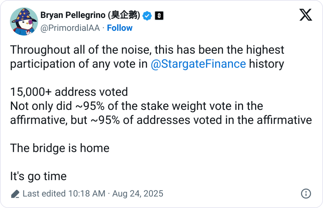 LayerZero co-founder and CEO Bryan Pellegrino wrote on X on Sunday that the Stargate community vote had “the highest participation of any vote” in the platform’s history.
