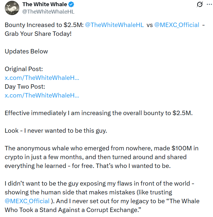 On Tuesday, the trader announced increasing the “bounty” against MEXC to $2.5 million, allocating an additional $250,000 for the group of users who participate in his social media campaign, which includes minting a free non-fungible token (NFT) on the Base network, tagging MEXC or its chief operating officer’s X account with the “#FreeTheWhiteWhale” tag.