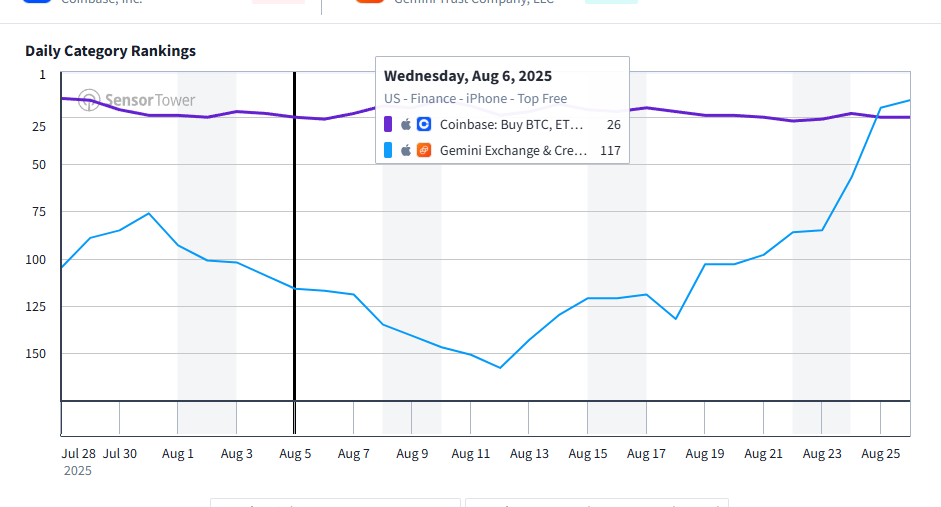 Sensor Tower data shows Gemini overtook Coinbase in the finance category rankings in the US after the announcement, with Gemini at 16th place at the time of publication, and Coinbase at 20th.