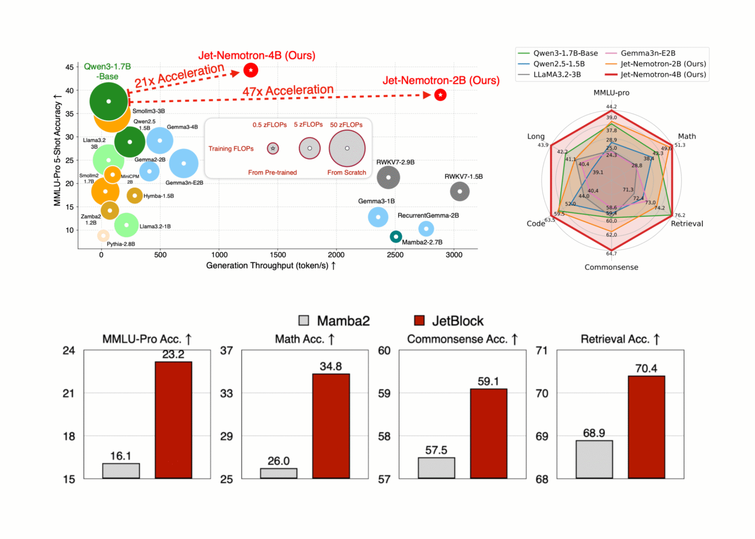 • Surgical Replacement: Replace computationally expensive full-attention (Transformers) with JetBlock, a new, hardware-efficient linear attention block designed for NVIDIA’s latest GPUs.