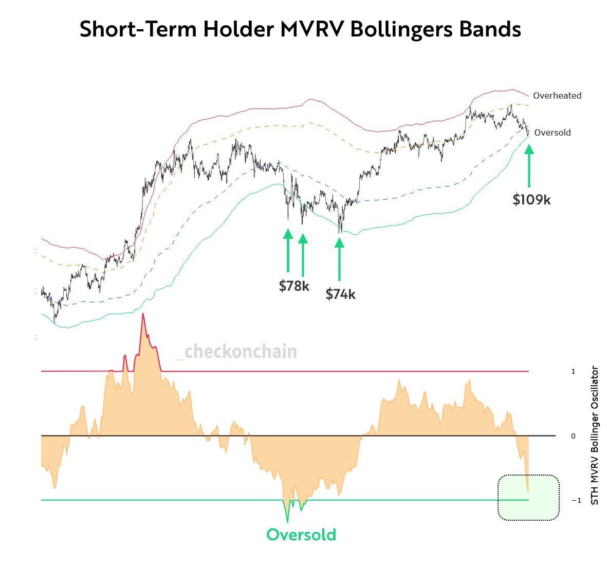 “On the pullback to $109K, $BTC tapped the ‘oversold’ zone on the short-term holder MVRV Bollinger Band,” said analyst Frank Fetter in an X post on Thursday.