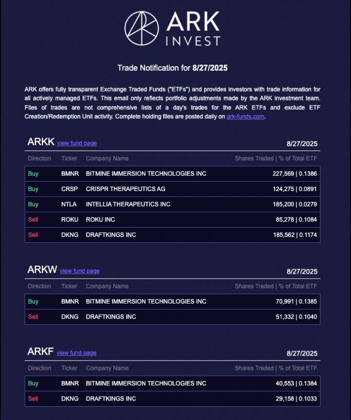 According to ARK’s trading disclosures on August 27, the firm bought 339,113 BitMine shares spread across three ETFs.