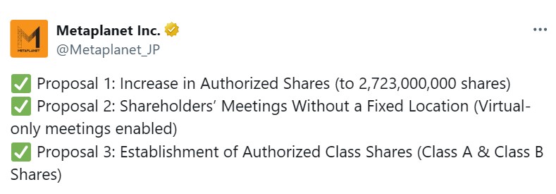 At an extraordinary general meeting on Monday, investors backed amendments to the company’s articles of incorporation to expand its authorized shares to 2.7 billion. It also introduced a new dual-class preferred stock system that would allow Metaplanet to attract different types of investors while preserving control for existing shareholders.