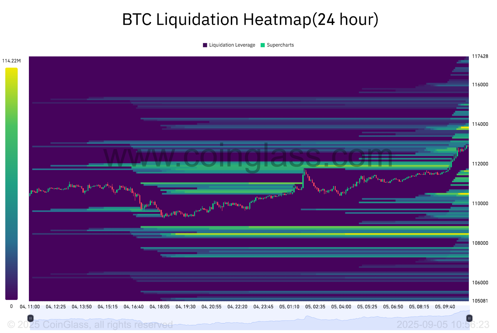 CoinGlass’ liquidity heatmap showed the price eating away some of that liquidity on the day, with the remainder extending to $115,000.