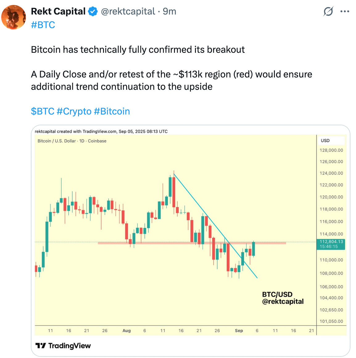 Fellow trader Rekt Capital flagged $113,000 as the level to reclaim to “fully confirm the breakout” and raise the chances of more sustained upside.