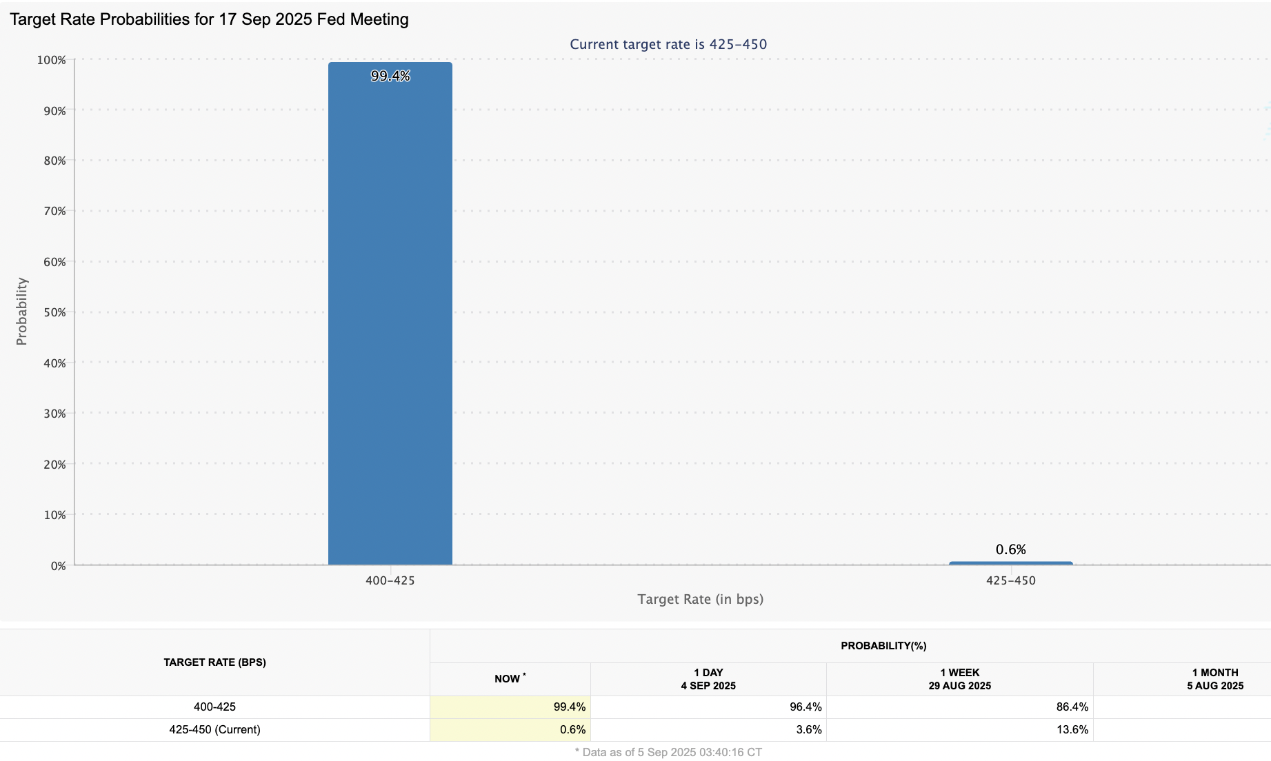 Market participants are now expecting a 99.4% probability that the Fed will lower the benchmark rate by 25 basis points in its September meeting, a move that many traders hope will spark a turnaround in BTC price, per the CME Group’s FedWatch tool.