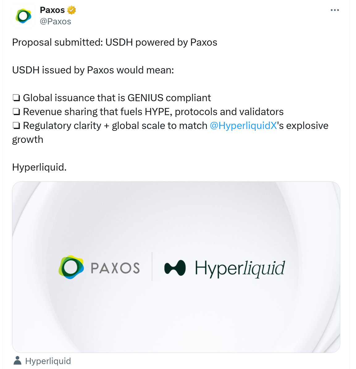 “We propose the launch of USDH, a Hyperliquid-first, fully compliant stablecoin purpose built to drive adoption, align incentives, and anchor the ecosystem’s next era of growth,” Paxos wrote.