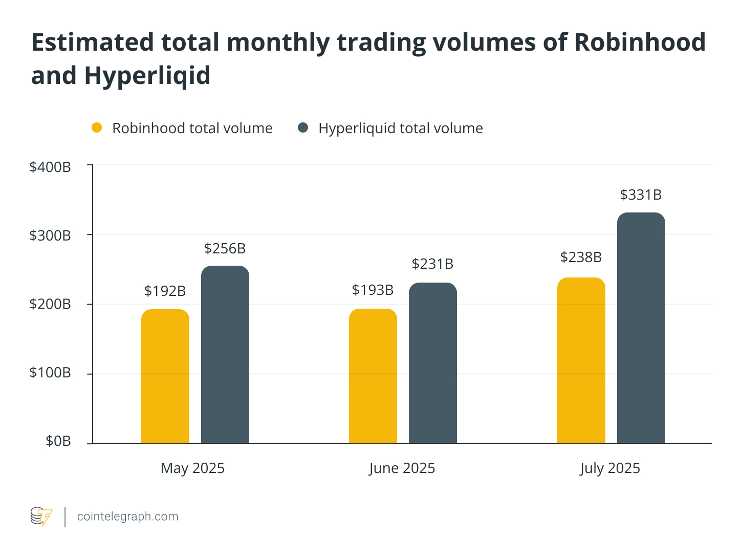 Hyperliquid processed around $330 billion in trading volume in July 2025, briefly surpassing Robinhood.