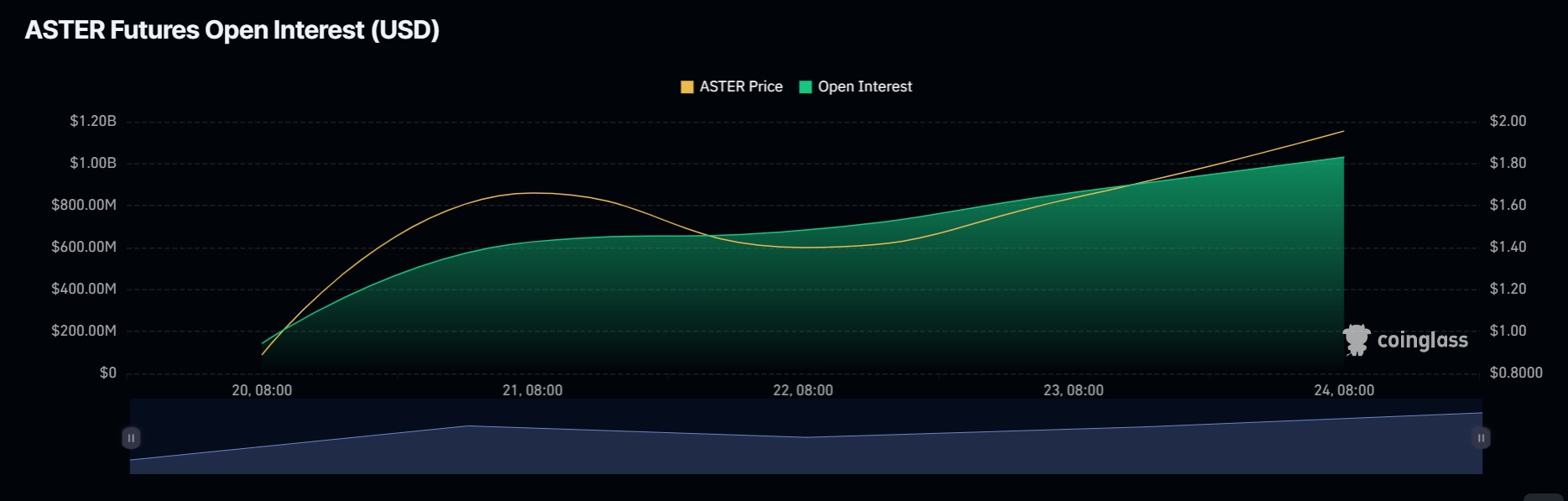 On Wednesday, CoinGlass data showed that Aster’s open interest jumped from $3.72 million on Friday to $1.25 billion at the time of writing. The spike in active contracts signaled that traders were piling into the platform, challenging its biggest competitor, Hyperliquid.