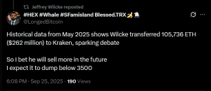 In August, Wilcke sent $9.22M in ETH to Kraken after moving $262M earlier and then reposted a tweet from another user that said, ”I bet he will sell more in the future.”