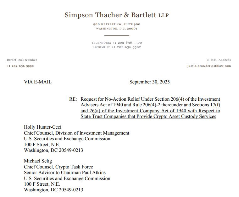 SEC staff said in the letter that state trust companies can be used as custodians, provided it has procedures designed to safeguard crypto, and the adviser and fund managers follow specific criteria, such as performing due diligence and determining it is in the best interest of their clients.